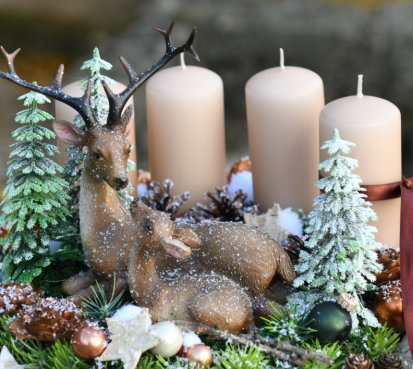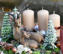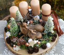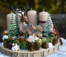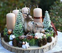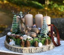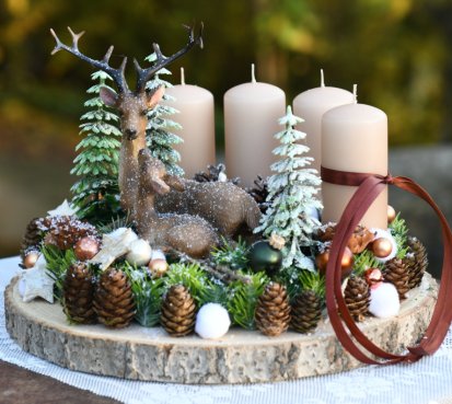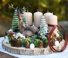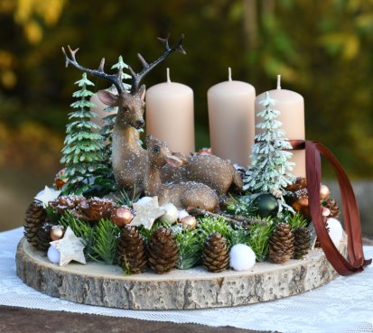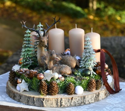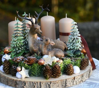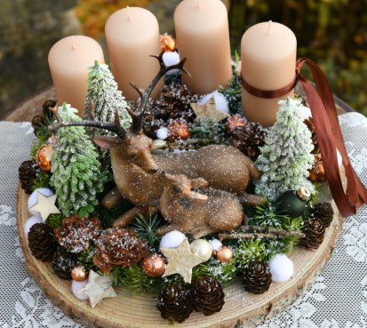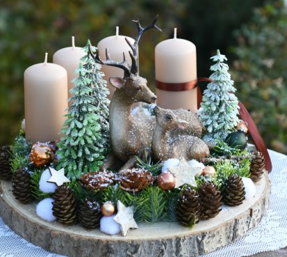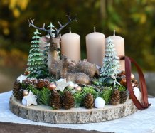 Dekorace v přírodním stylu je naaranžována na dřevěném plátu, zdobena vánočními a přírodními přízdobami....svíčky na bezpečnostních bodcích jsou vyměnitelné....figury jsou z polyresinu