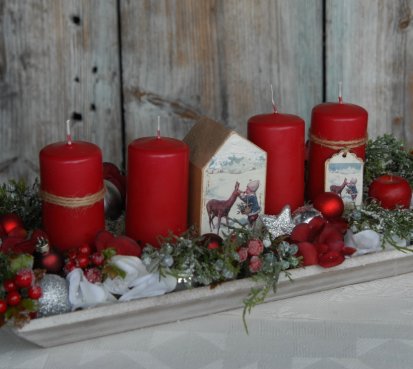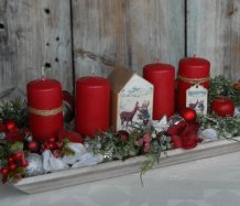 Dekorace je naaranžována na krásném dřevěném podnose se čtyřmi vyměnitelnými svíčkami na bezpečnostních bodcích. Spousta vánočních přízdob a krásný dřevěný domeček k tomu