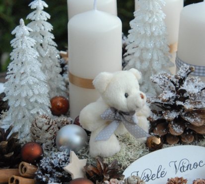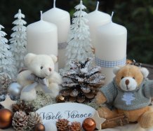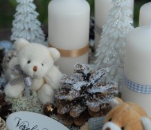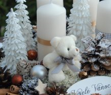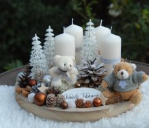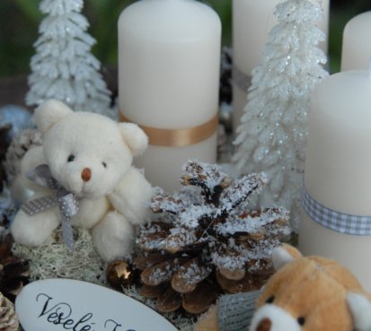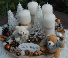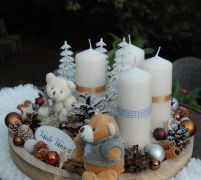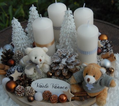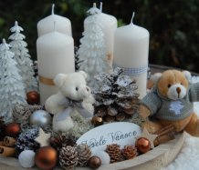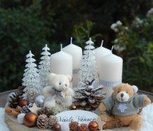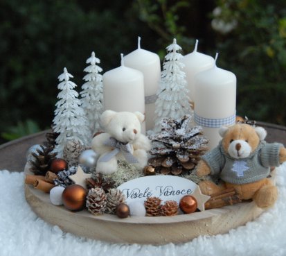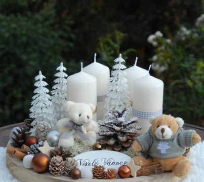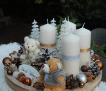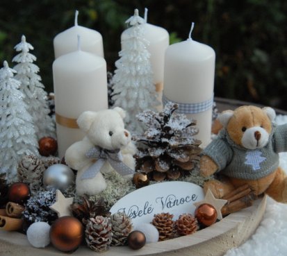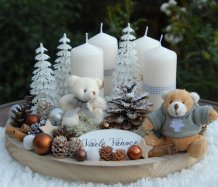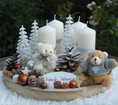 Luxusní adventní dekorace s medvídky na dřevěném podnosu s velkým množstvím vánočních přízdob. Svíčky na bezpečnostních bodcích jsou vyměnitelné