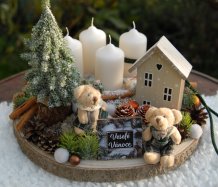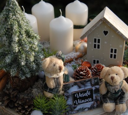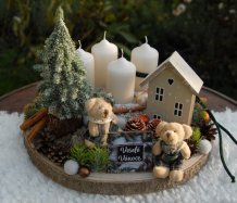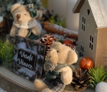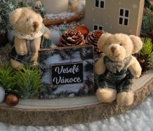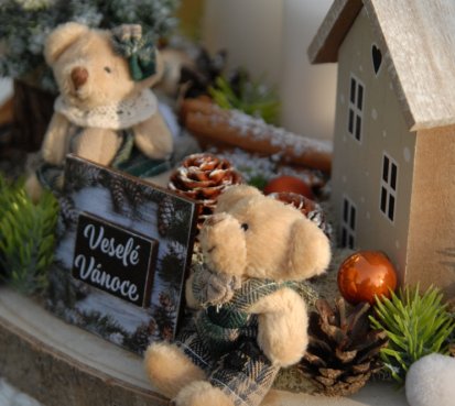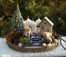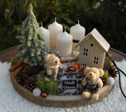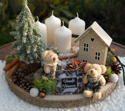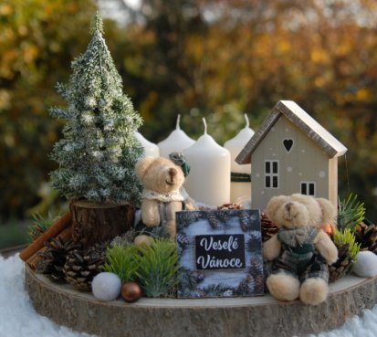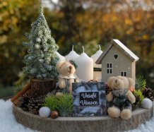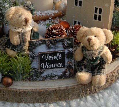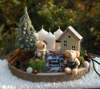 Bohatě zdobená dekorace na dřevěné kulatině vánočními přízdobami, přírodninami, dřevěným domečkem a dva krásní medvídci k tomu..