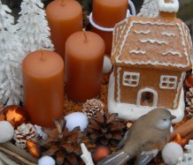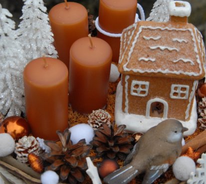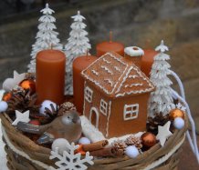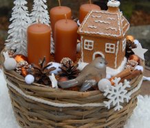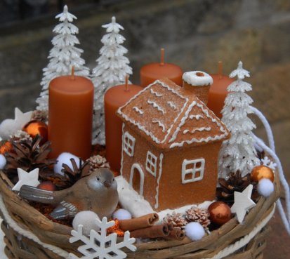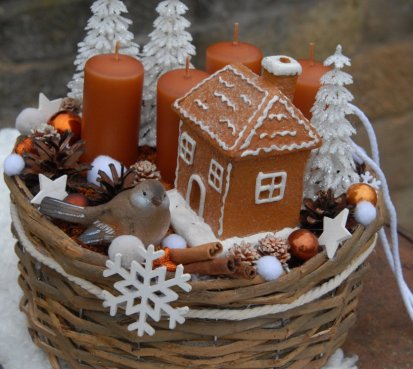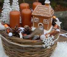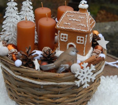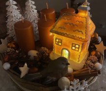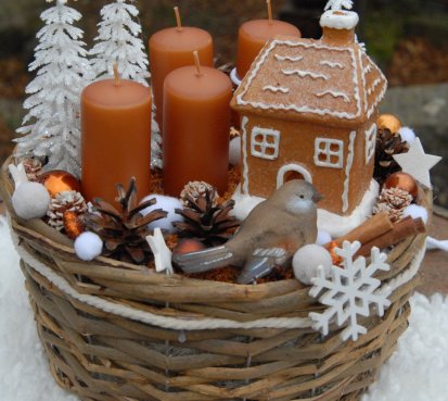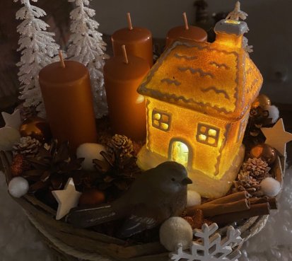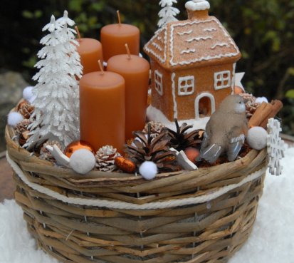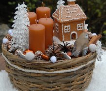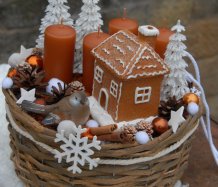 Bohatě zdobená adventní dekorace v proutěném košíku s krásnou chaloupkou z polyresinu, která je opatřena led světýlky...svíčky na bezpečnostním bodci jsou vyměnitelné