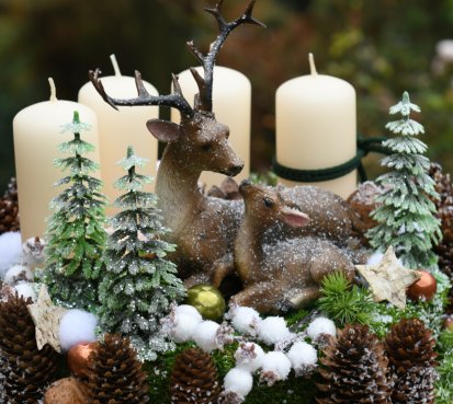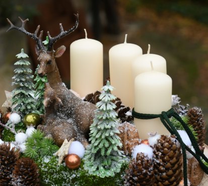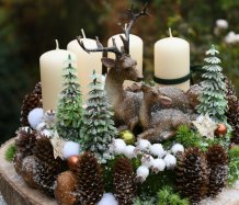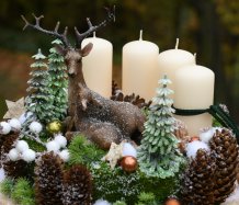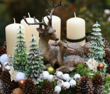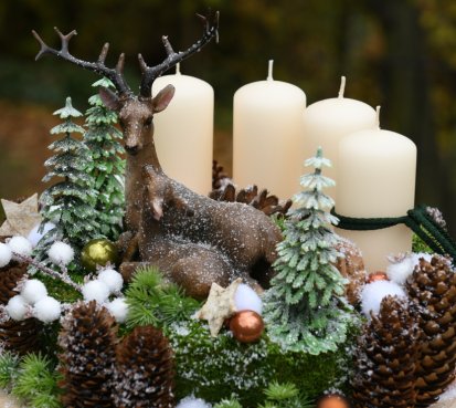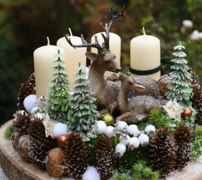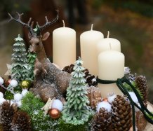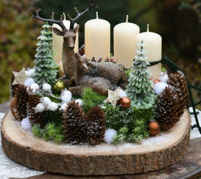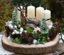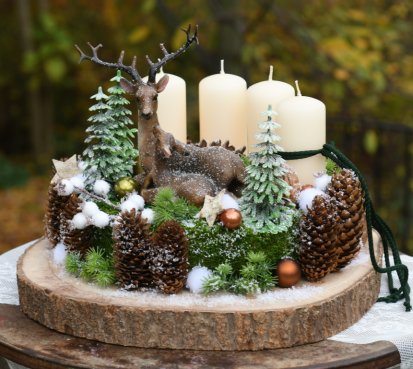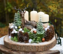 Veliká dekorace je naaranžována na dřevěném plátu, bohatě zdobena vánočními přízdobami a přírodninami. Svíčky na bezpečnostních bodcích jsou vyměnitelné....krásné figurky jsou z polyresinu