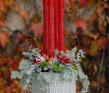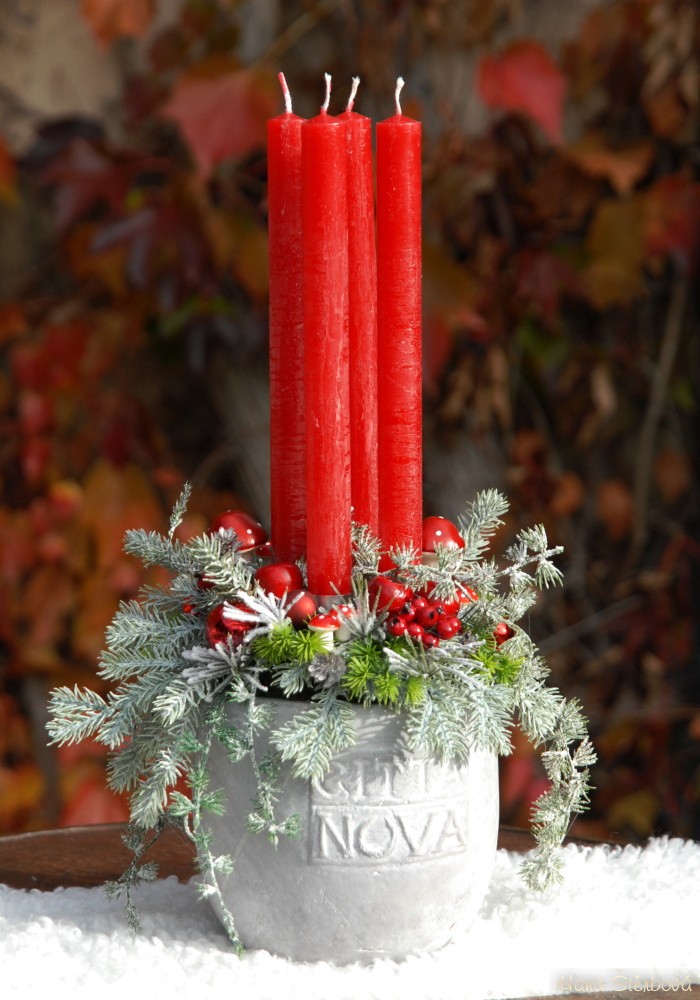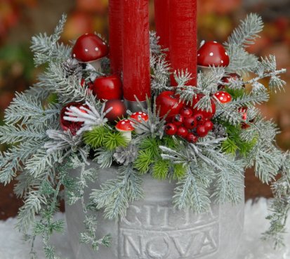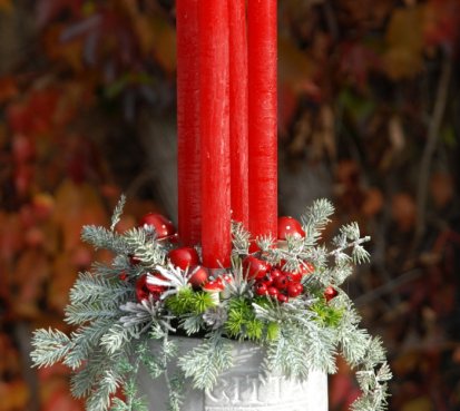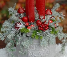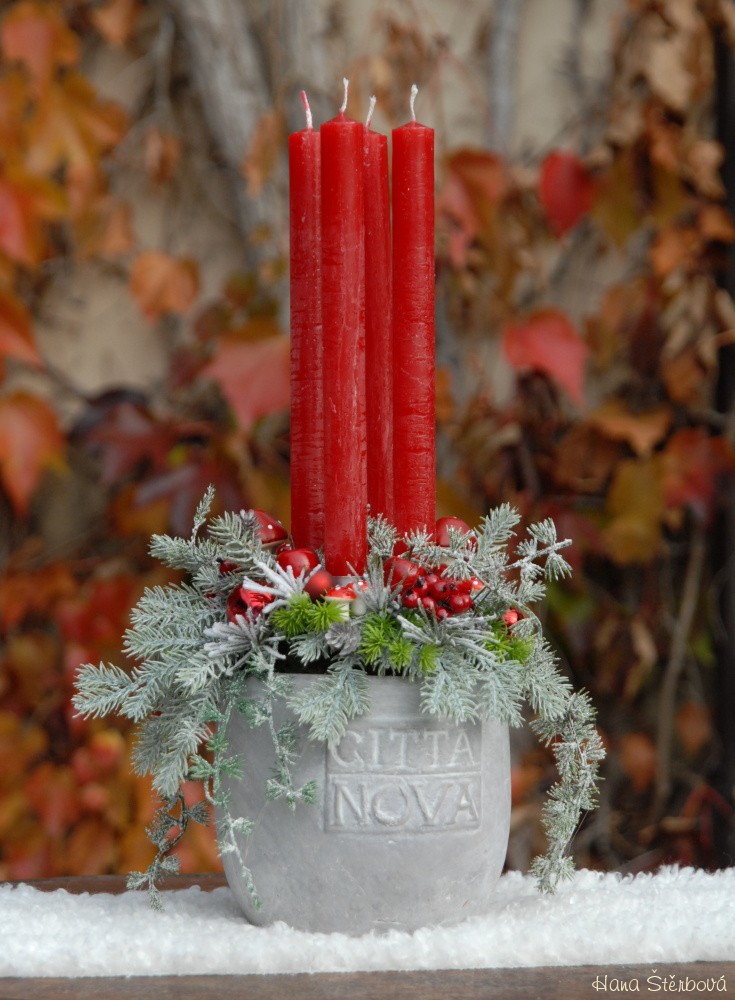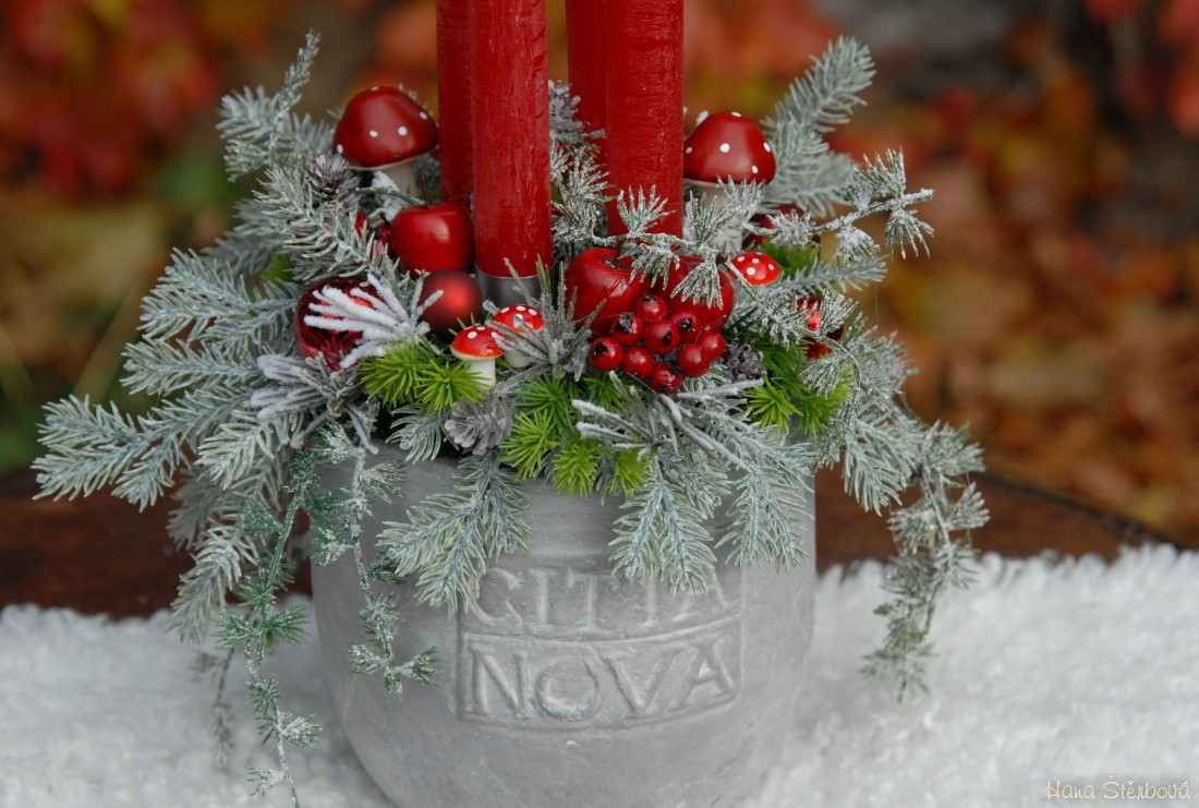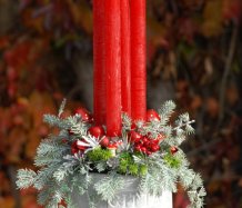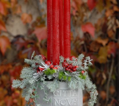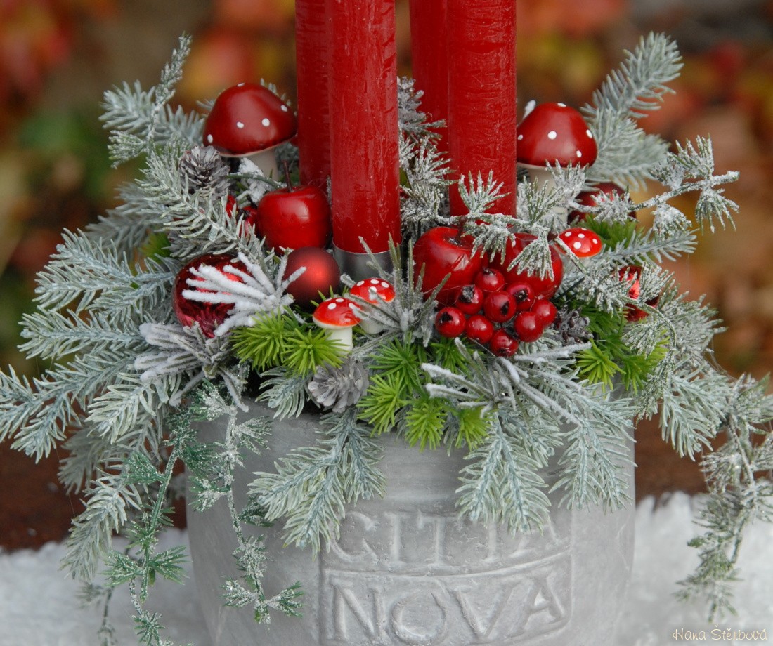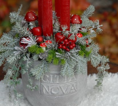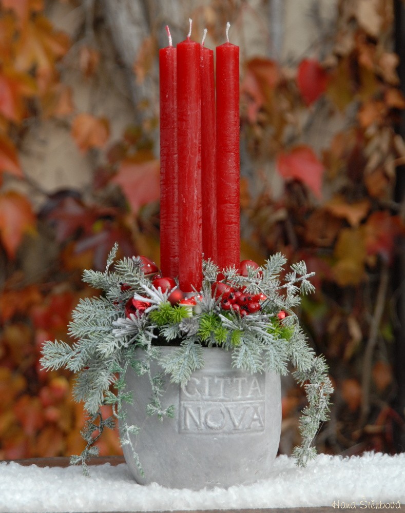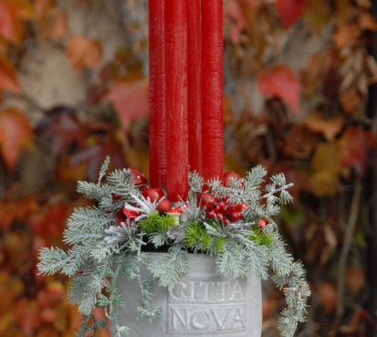 Dekorace je zasazena do luxusní keramické nádoby s krásným umělým jehličím, vánočními přízdobami