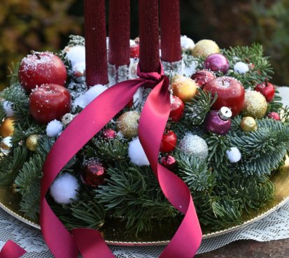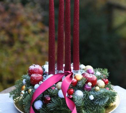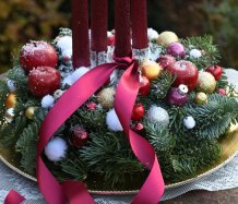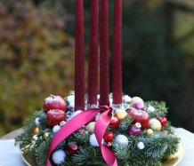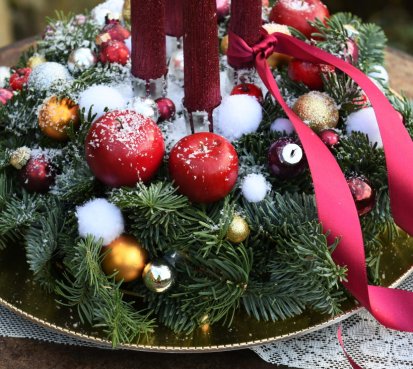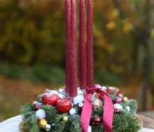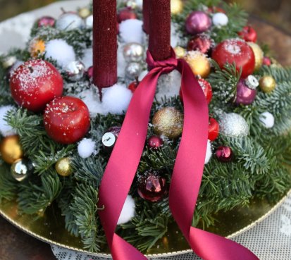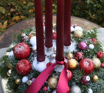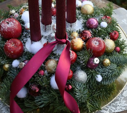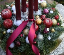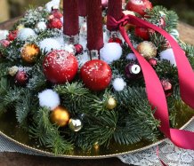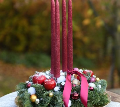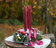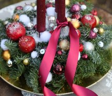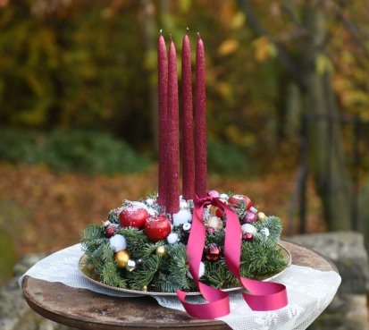Věnec je vytvořen z čerstvé jedle Nobilis, volně položen na zlatý podnos. Bohatě zdoben vánočními přízdobami, svíčky na bezpečnostních bodcích jsou vyměnitelné