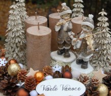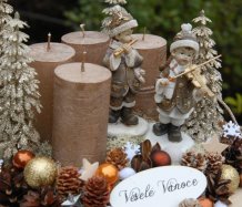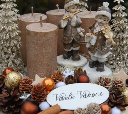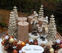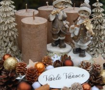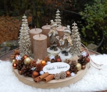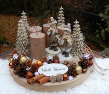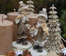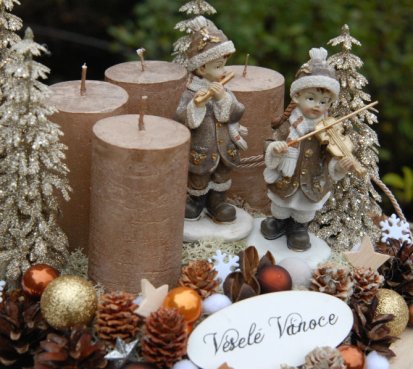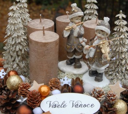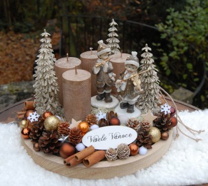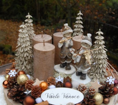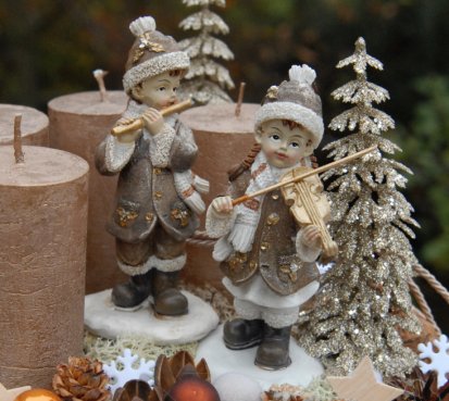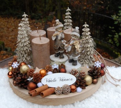 Bohatě zdobená luxusní dekorace vánočními přízdobami na dřevěném podnosu...hudebníčci jsou z polyresinu....svíčky na bezpečnostním bodci jsou vyměnitelné