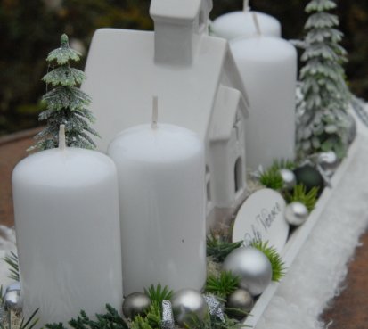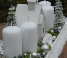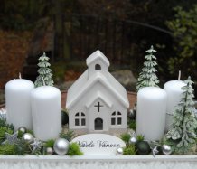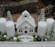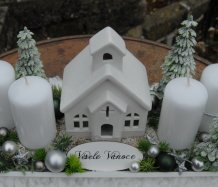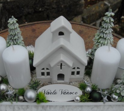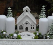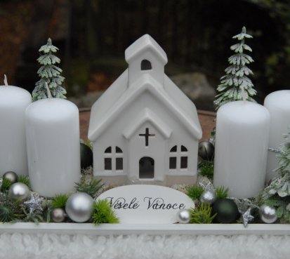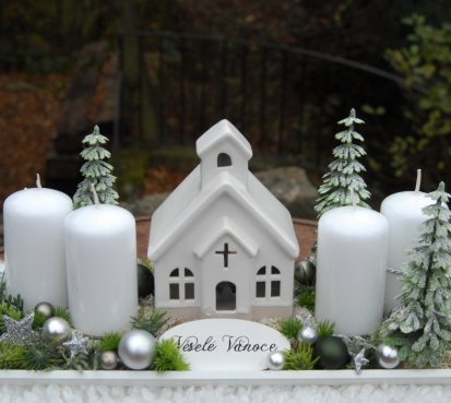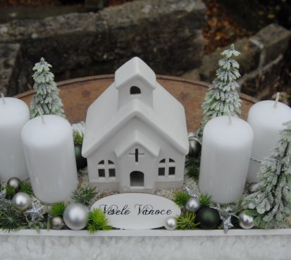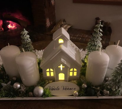 Bohatě zdobená vánoční dekorace na dřevěném tácu s keramickým kostelíkem s led světýlky....svíčky na bezpečnostním bodci jsou vyměnitelné