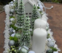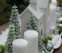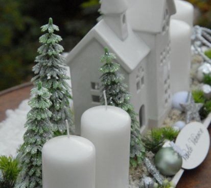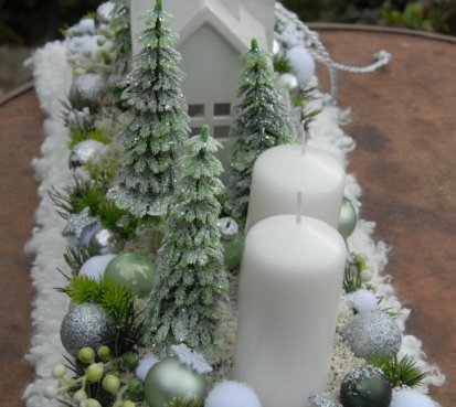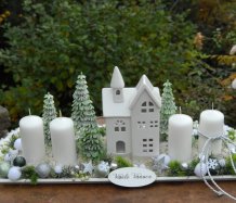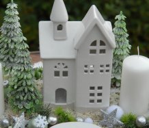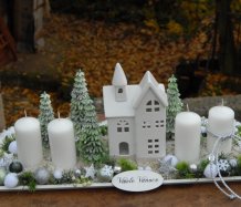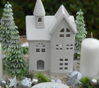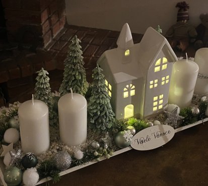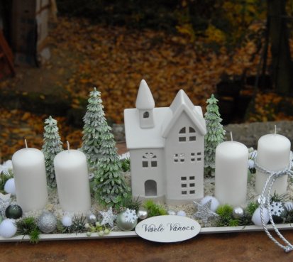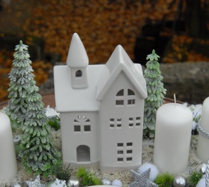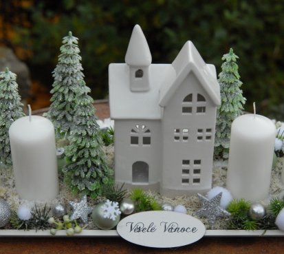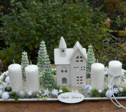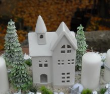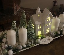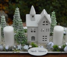 Bohatě zdobená velká dekorace na dřevěném podnosu s krásným keramickým kostelíkem s led světýlky....svíčky na bezpečnostních bodcích jsou vyměnitelné