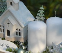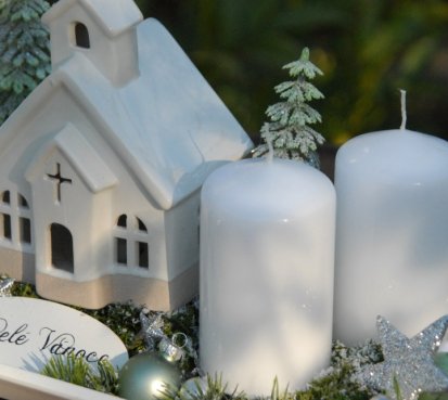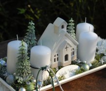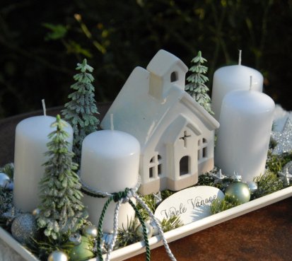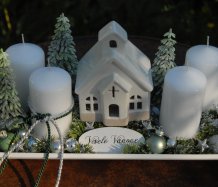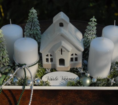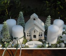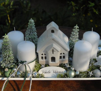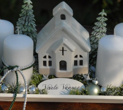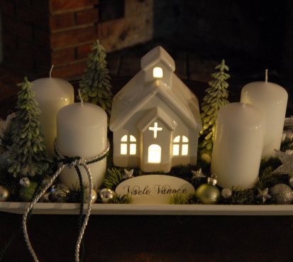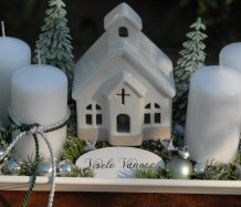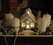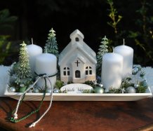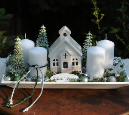 Dekorace je naaranžována na krásném dřevěném podnosu s velkým množstvím vánočních přízdob, svíčky na bezpečnostních bodcích jsou vyměnitelné...keramický kostelík je opatřen led světýlkem