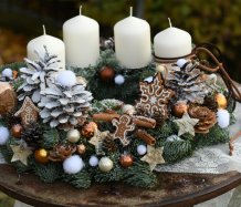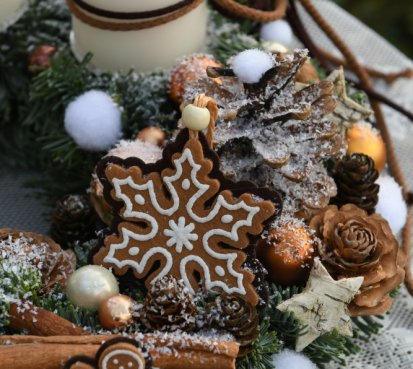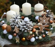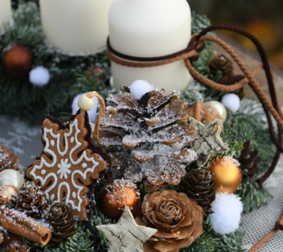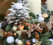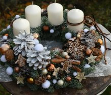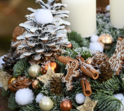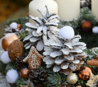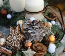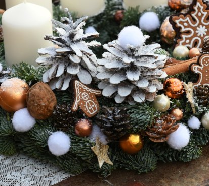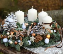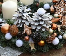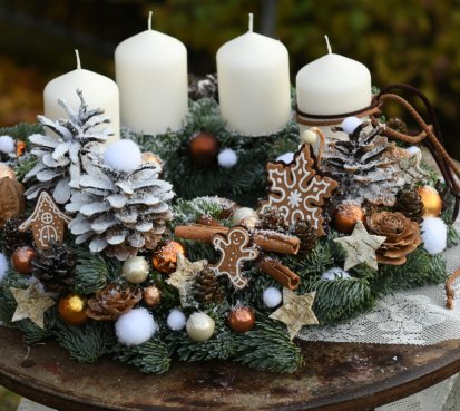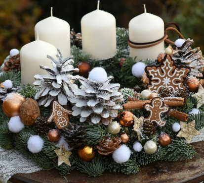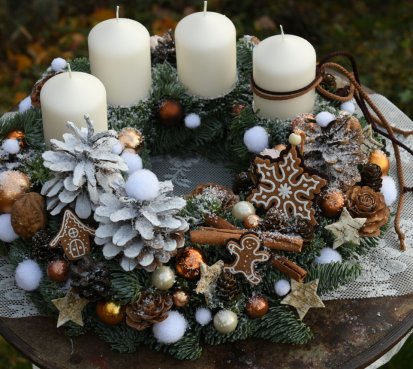 Veliký věnec je vytvořen z čerstvé jedle Nobilis, bohatě zdoben vánočními přízdobami a přírodninami, svíčky na bezpečnostních bodcích jsou vyměnitelné