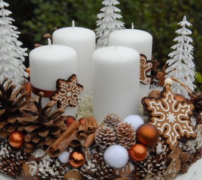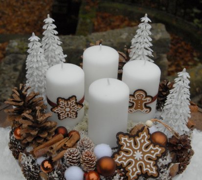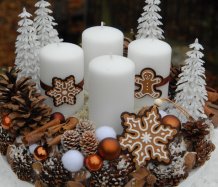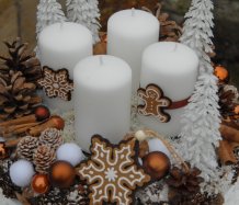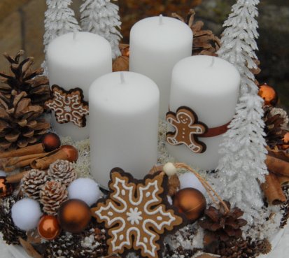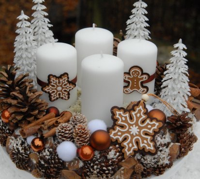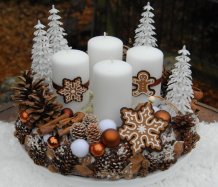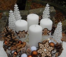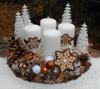 Bohatě zdobená vánoční dekorace přírodninami, perníčky z filcu, vánočními přízdobami na dřevěném podnosu....svíčky na bezpečnostním bodci jsou vyměnitelné