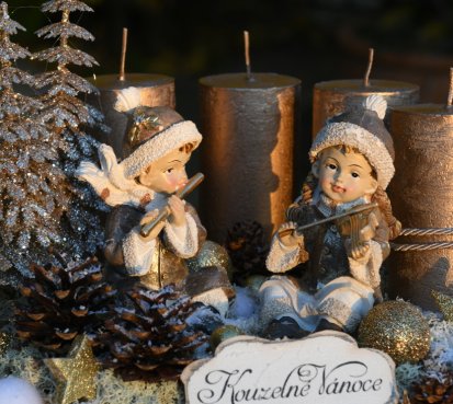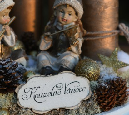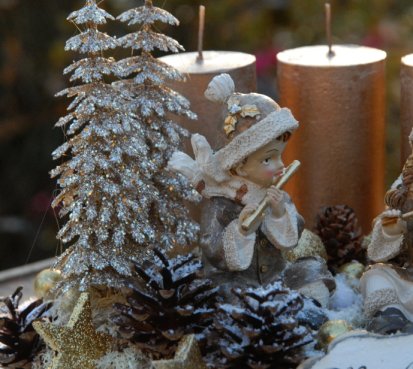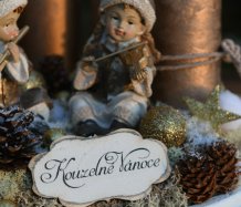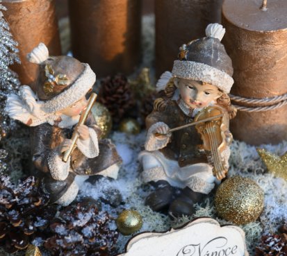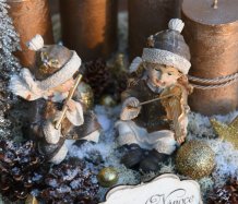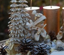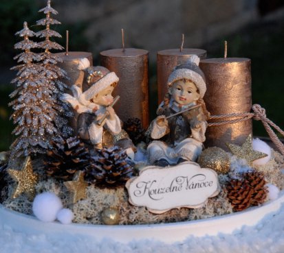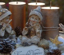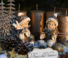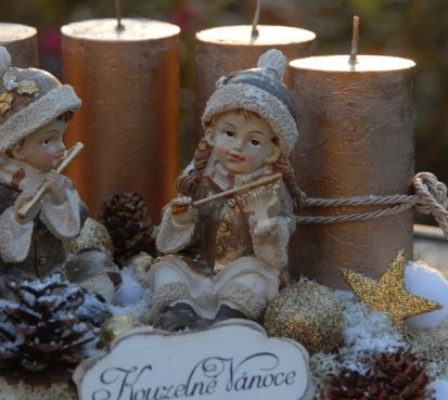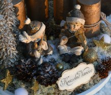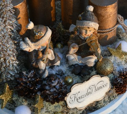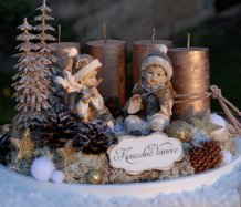 Bohatě zdobená adventní dekorace na dřevěném podnosu...figurky jsou z polyresinu.....svíčky na bezpečnostním bodci jsou vyměnitelné