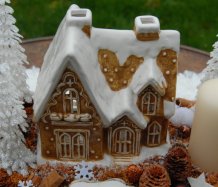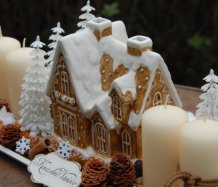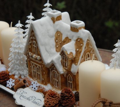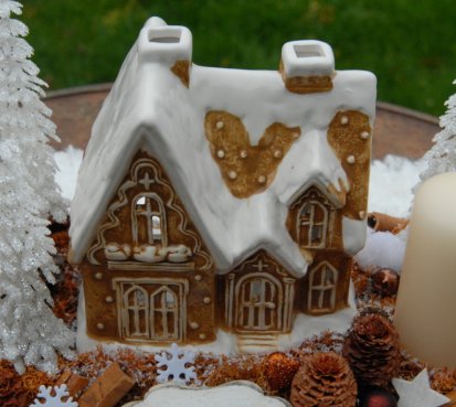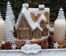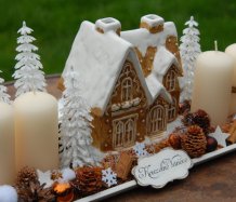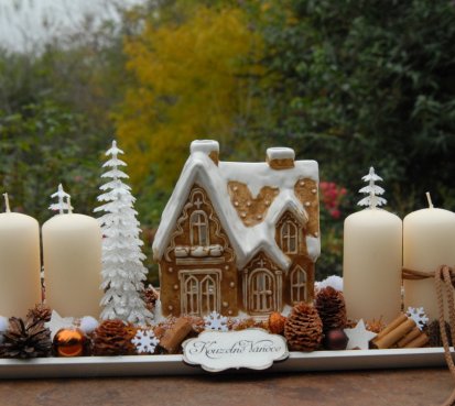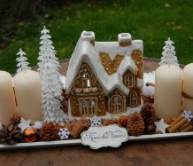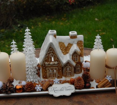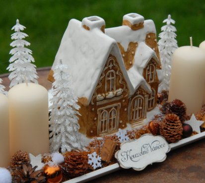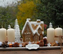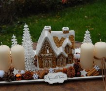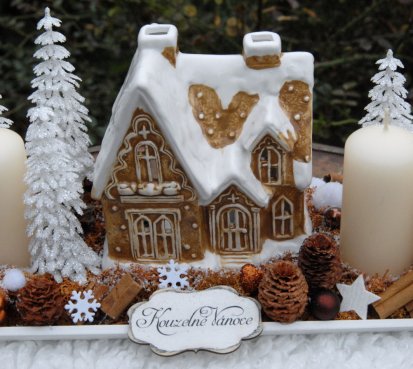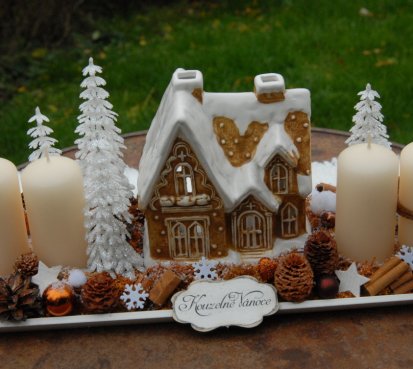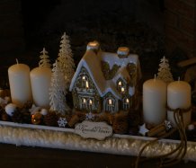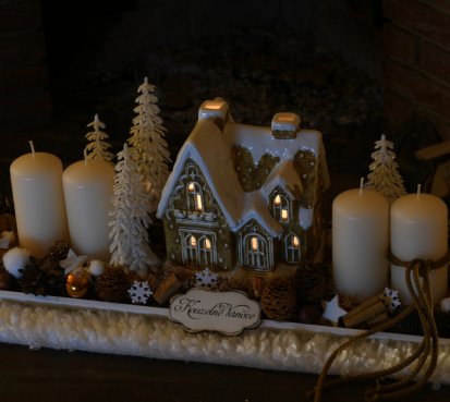 Veliká dekorace je naaranžována na dřevěném tácu, bohatě zdobena vánočními přízdobami, svíčky jsou vyměnitelné na bezpečnostním bodci