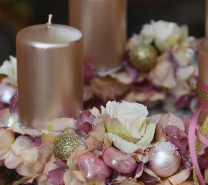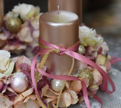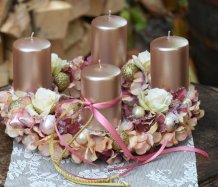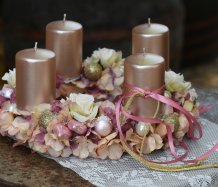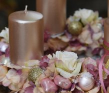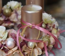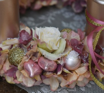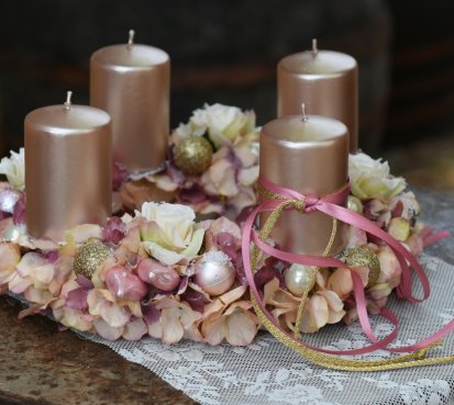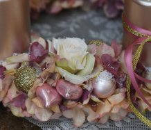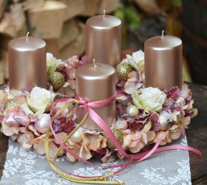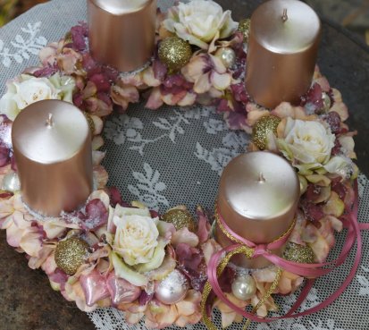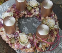Věnec je vytvořen na pevném korpusu, bohatě zdoben zasněženými květy a vánočními kouličkami. Svíčky na bezpečnostních bodcích jsou vyměnitelné