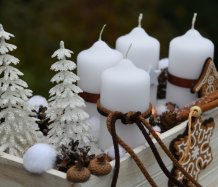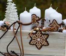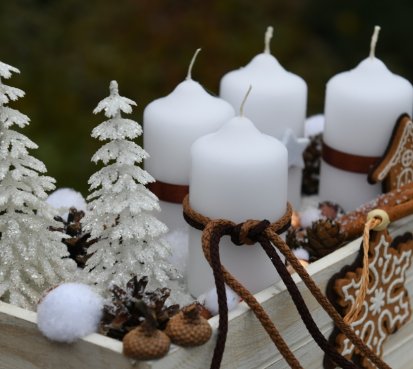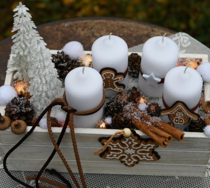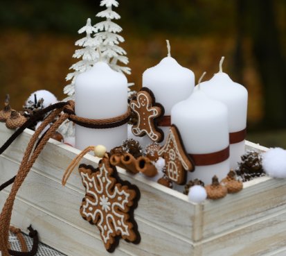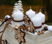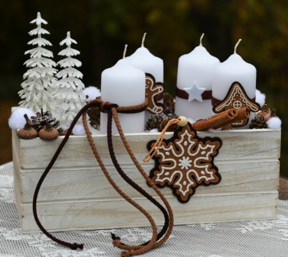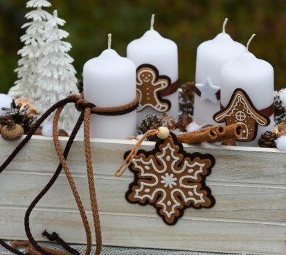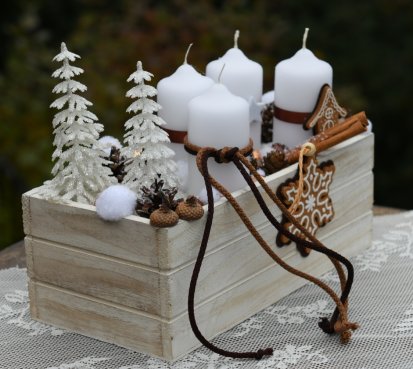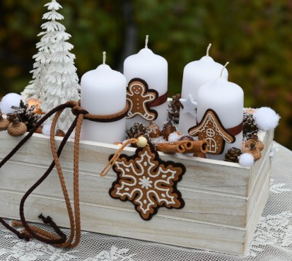 Dřevěná bedýnka je naaranžována vánočními přízdobami a krásnými filcovými perníčky. Svíčky na bezpečnostním bodci jsou vyměnitelné