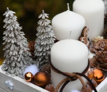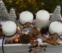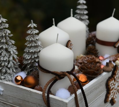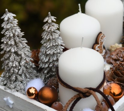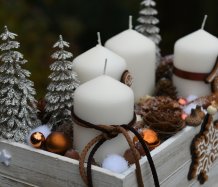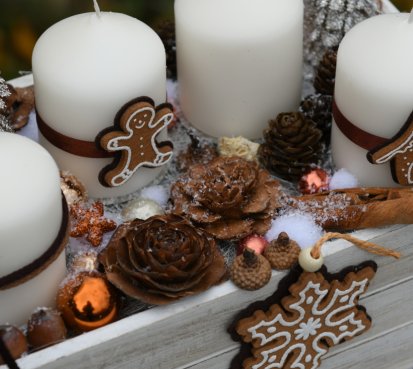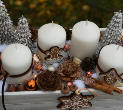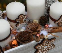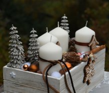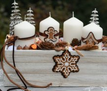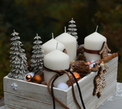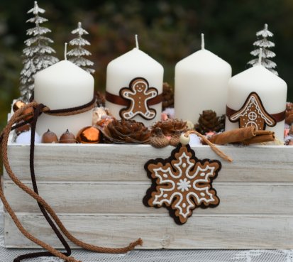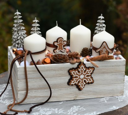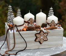 Dřevěná bedýnka je naaranžována vánočními přízdobami a krásnými filcovými perníčky. Svíčky na bezpečnostním bodci jsou vyměnitelné