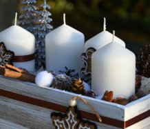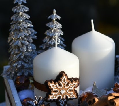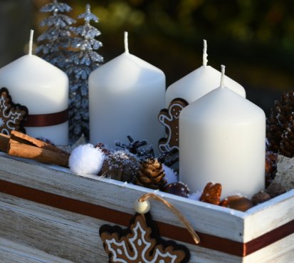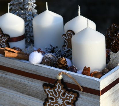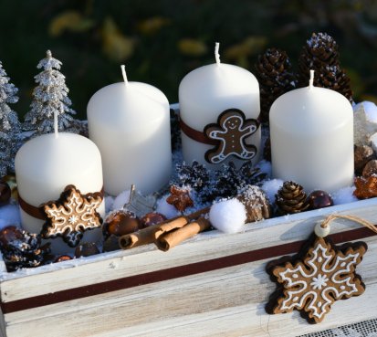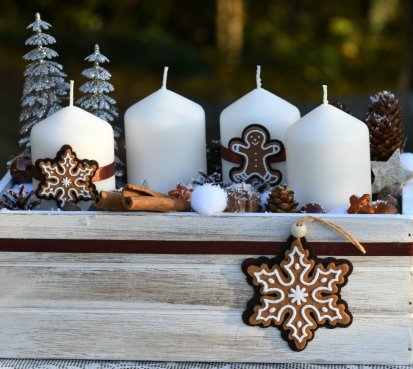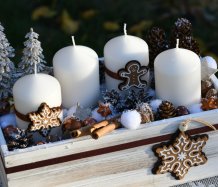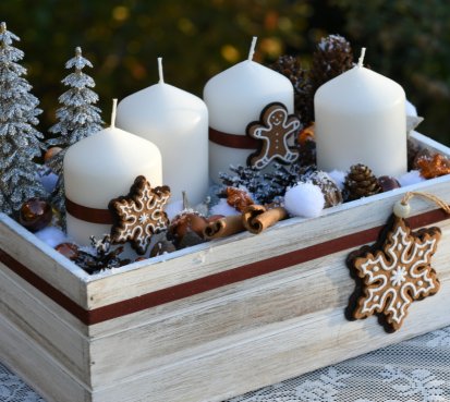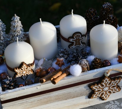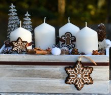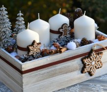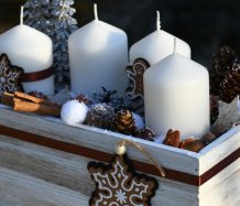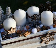 Dřevěná bedýnka je naaranžována spoustou vánočních a přírodních přízdob, dokonalé perníčky jsou z filcu....svíčky na bezpečnostním bodci jsou vyměnitelné