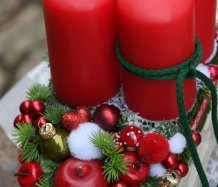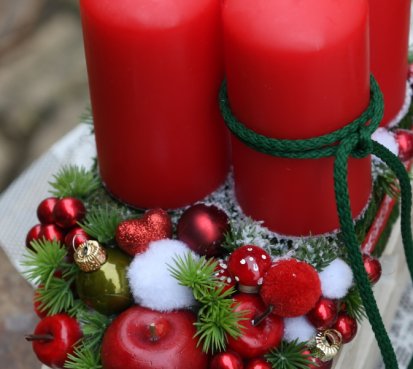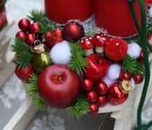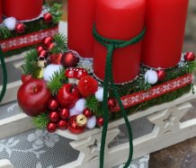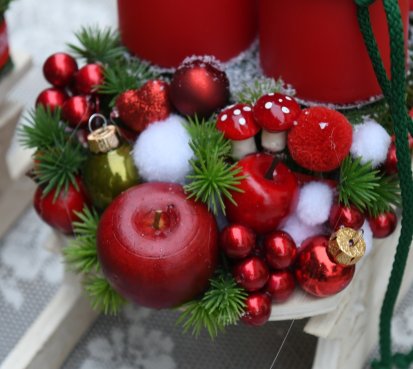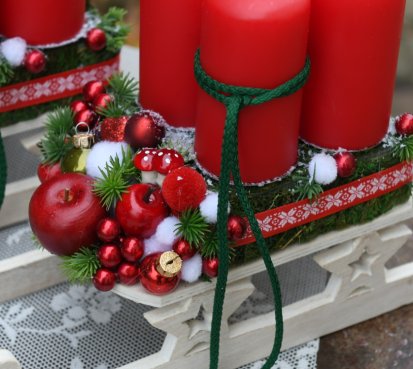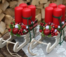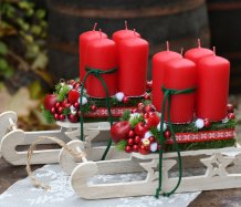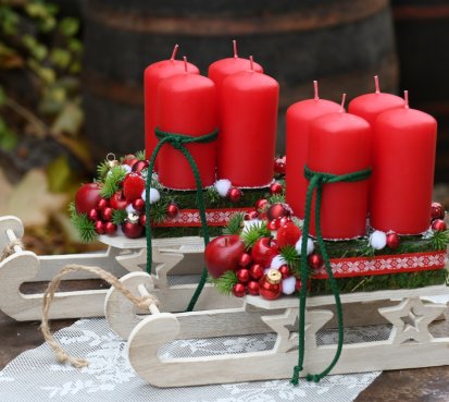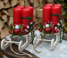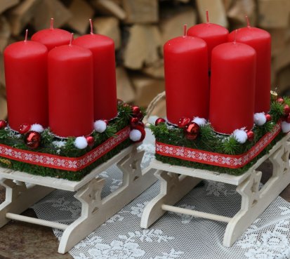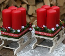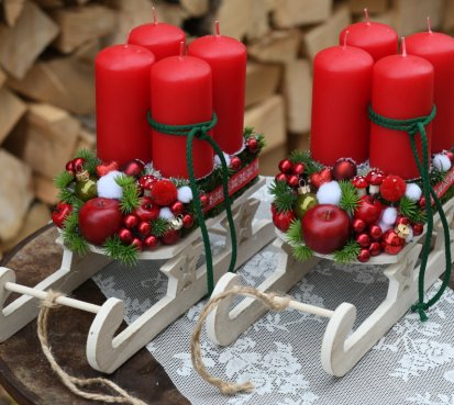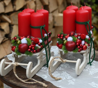 Dřevěné sáňky jsou naaranžovány vánočními přízdobami a vyměnitelnými svíčkami na bezpečnostních bodcích....