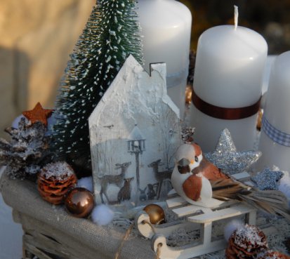 Dekorace se stromečkem, zimní postavičkou, dřevěným domečkem..... je naaranžována v krásném patinovaném košíku se čtyřmi vyměnitelnými svíčkami na bezpečnostních bodcích