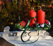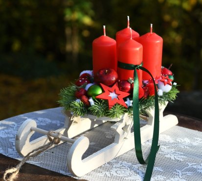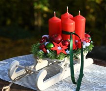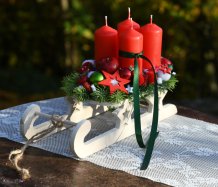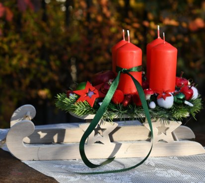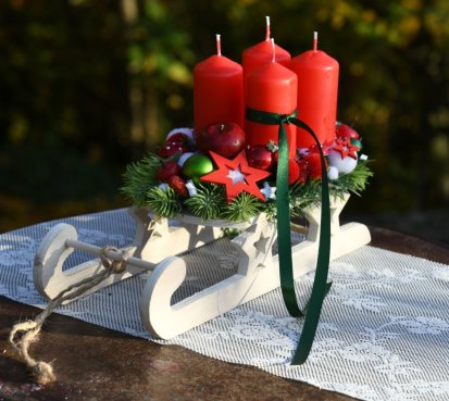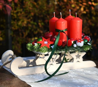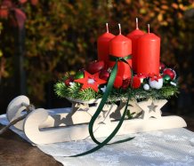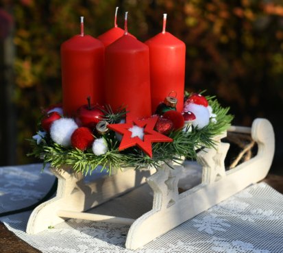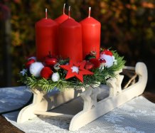 Dřevěné sáňky jsou naaranžovány vánočními přízdobami a vyměnitelnými svíčkami na bezpečnostních bodcích