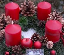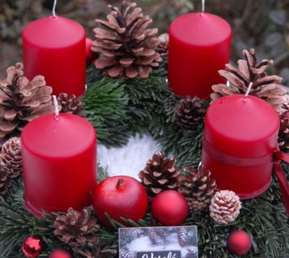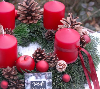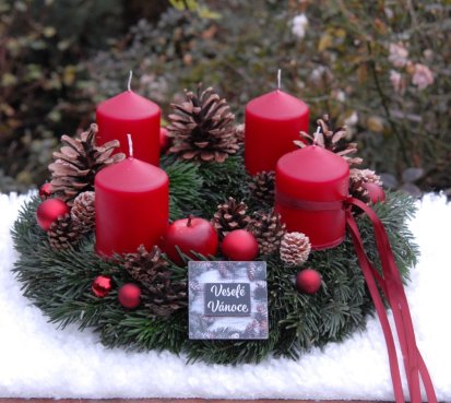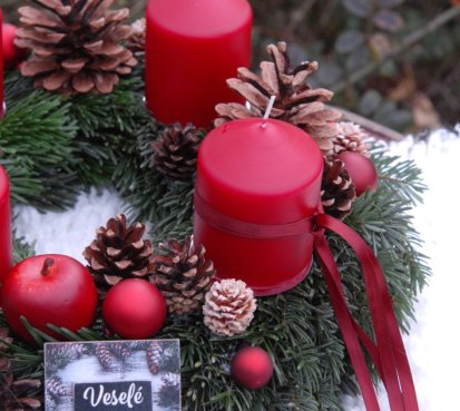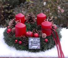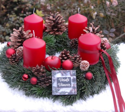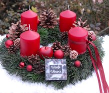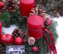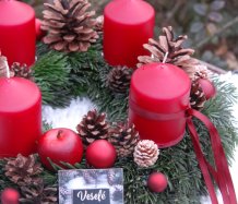 Věnec je umotán z čerstvé jedličky, zdoben přírodninami a vánočními přízdobami ....svíčky na bezpečnostních bodcích jsou vyměnitelné...cedulka je dřevěná