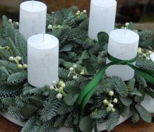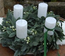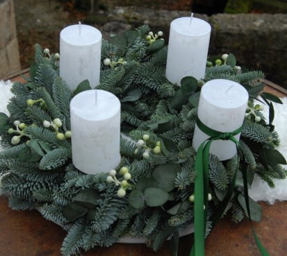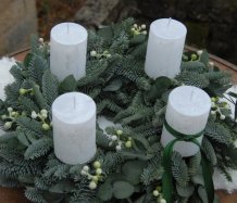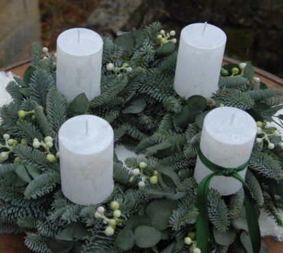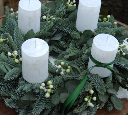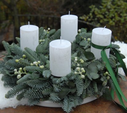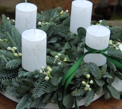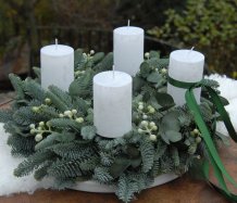 Věnec je vytvořen z čerstvé jedle a eukalyptu na bílém dřevěném podnosu.....vánoční přízdoby, vyměnitelné svíčky na bezpečnostních bodcích