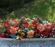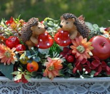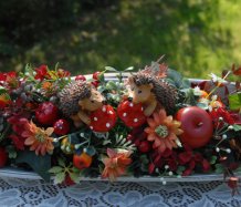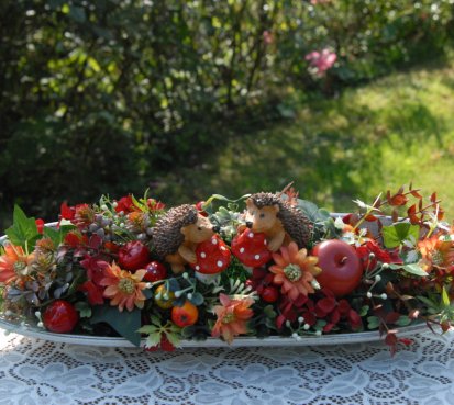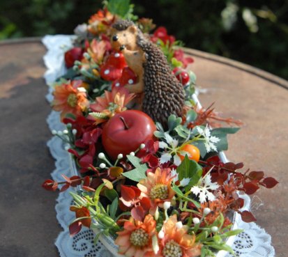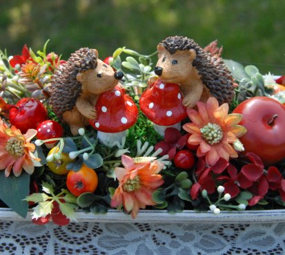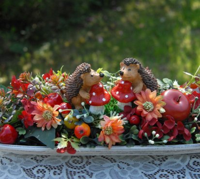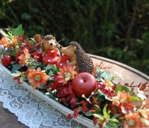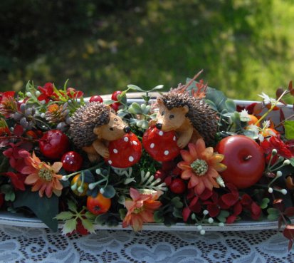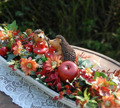 Bohatě zdobená podzimní dekorace na dřevěné podnosu....na vše dohlížejí dva roztomilí ježečkové