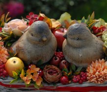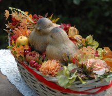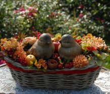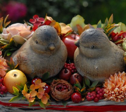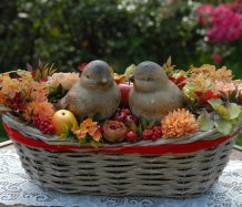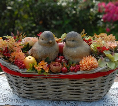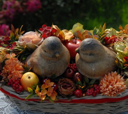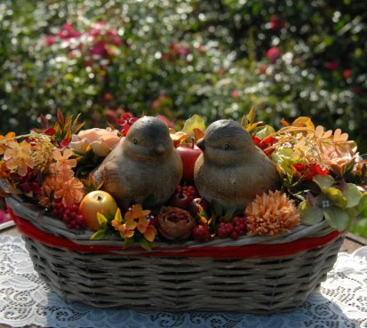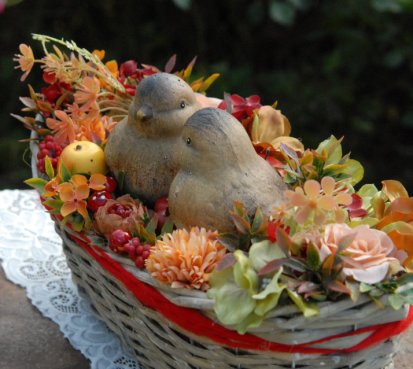 Krásný proutěný košík je bohatě zdoben dokonalými umělými květinami a plody....dva krásní ptáčci z keramiky k tomu
