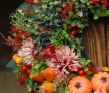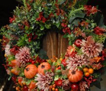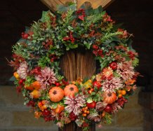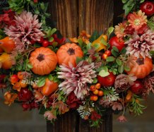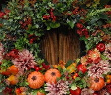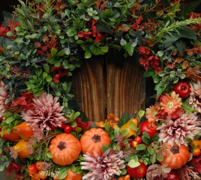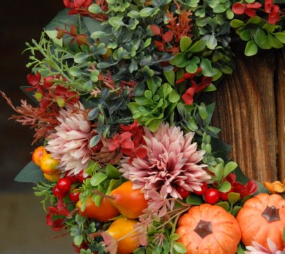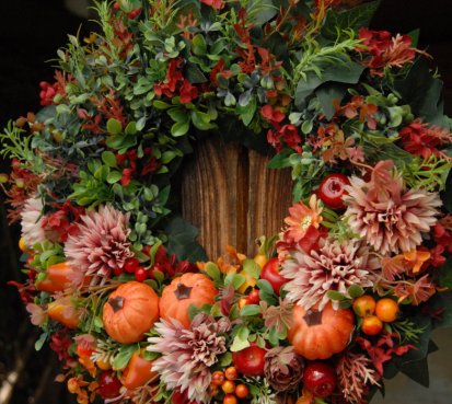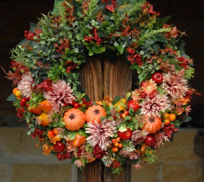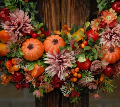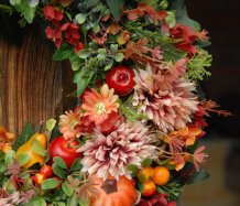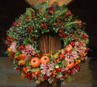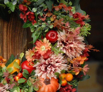 Velikánský bohatě zdobený věnec dokonalými umělými květinami a plody
