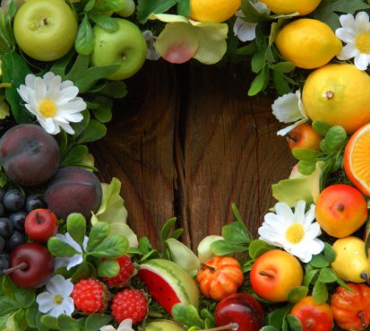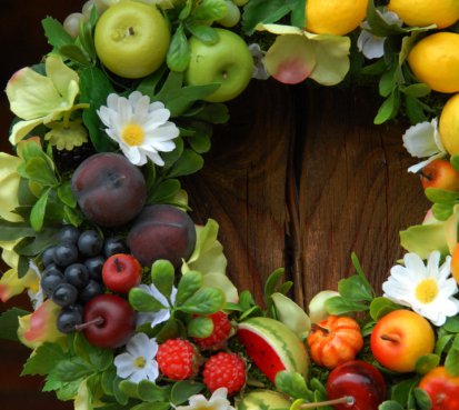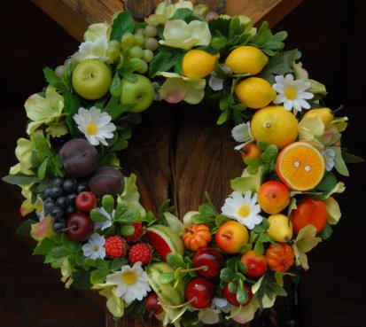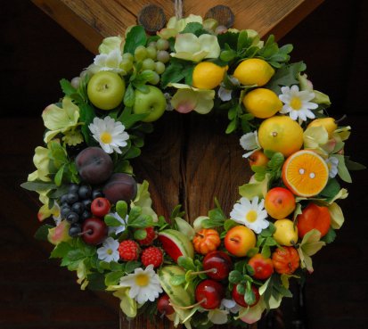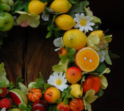 Věnec je vytvořen na pevném korpusu, bohatě zdoben dokonalým ovocem a květinami