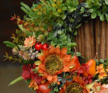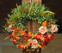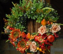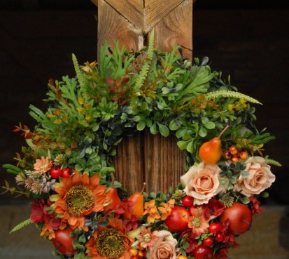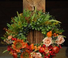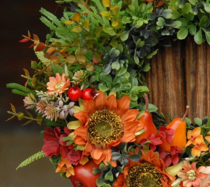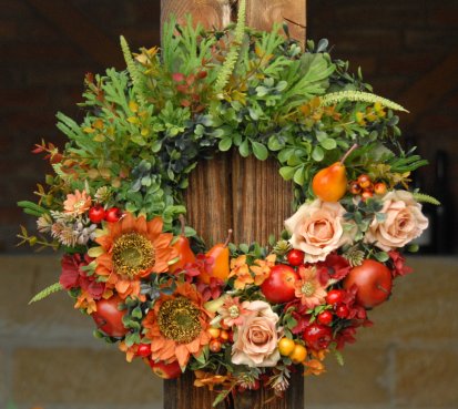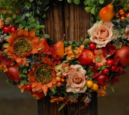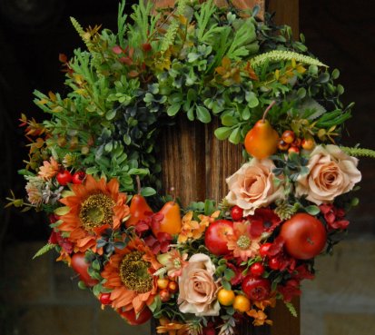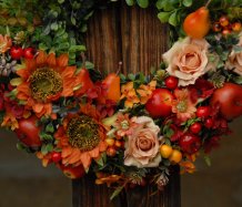 Bohatě zdobený věnec dokonalými umělými květinami a plody