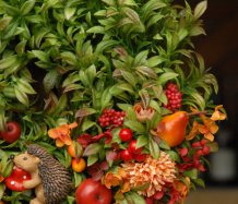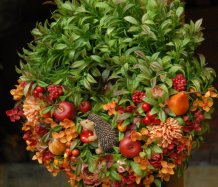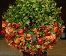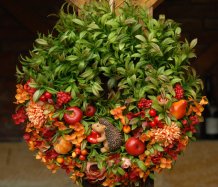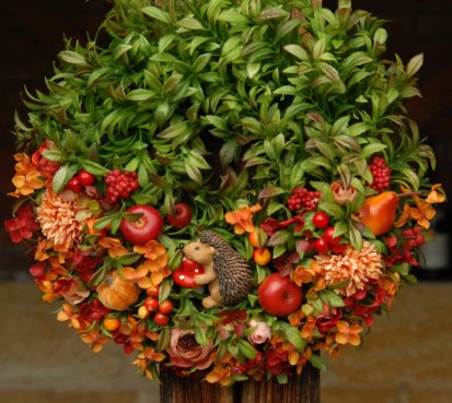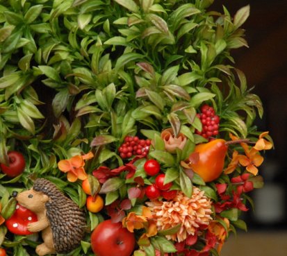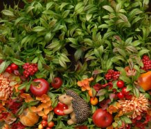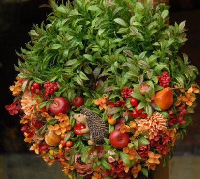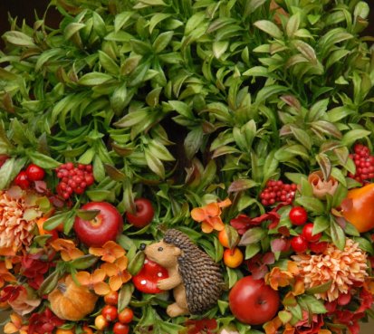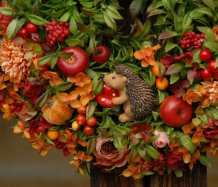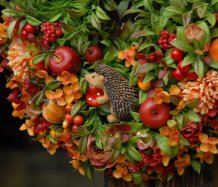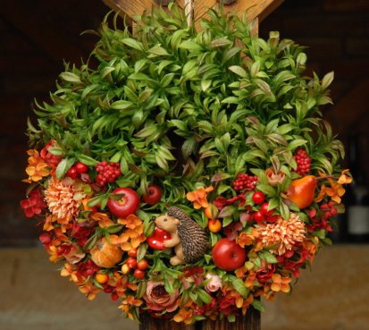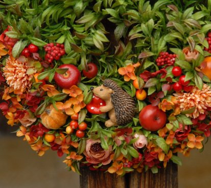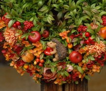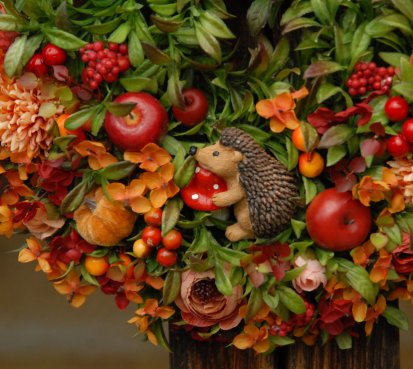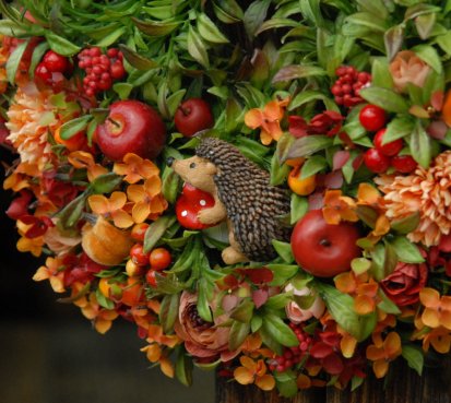 Bohatě zdobený věnec dokonalými umělými květinami a plody...krásný ježeček k tomu