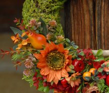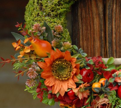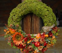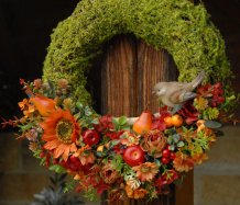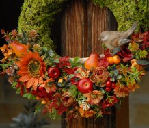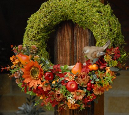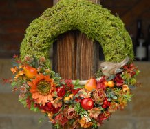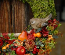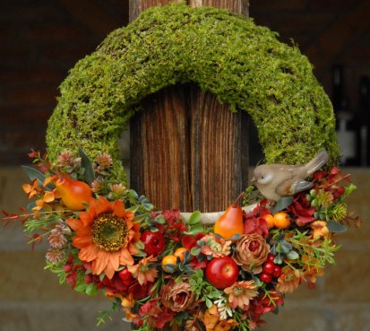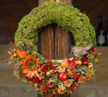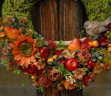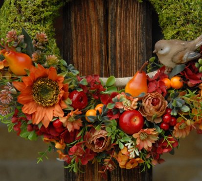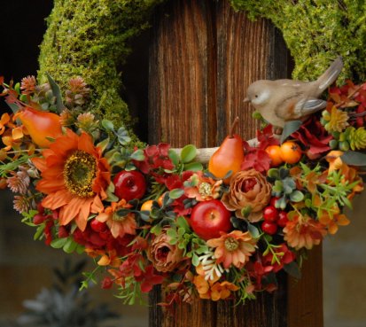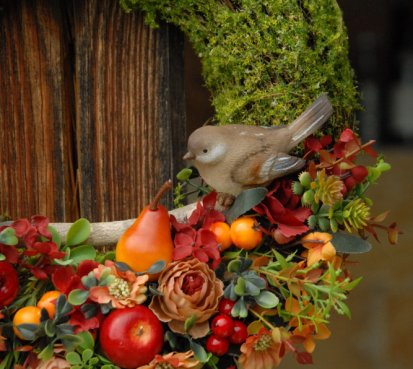 Bohatě zdobený podzimní věnec dokonalými umělými květinami a plody...roztomilý ptáček na vše dohlíží