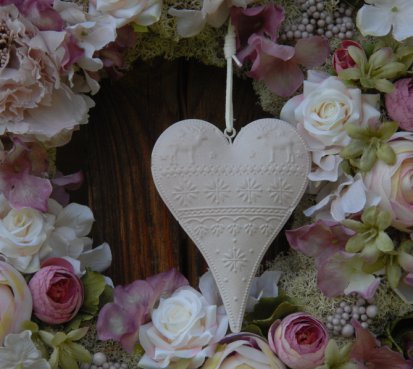 Mohutný věnec na pevném slámovém korpusu, nazdoben islandským lišejníkem a dokonalými látkovými květinami...krásné plechové srdce k tomu