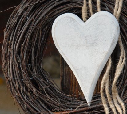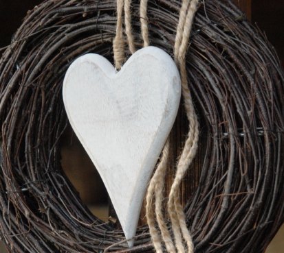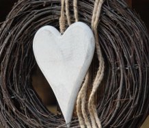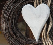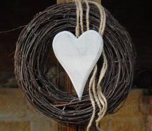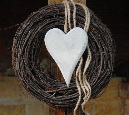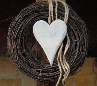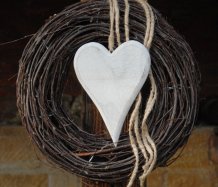 Věnec je vytvořen z březových proutků, ozdoben krásným dřevěným srdcem