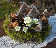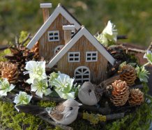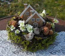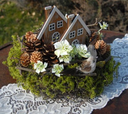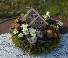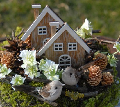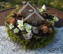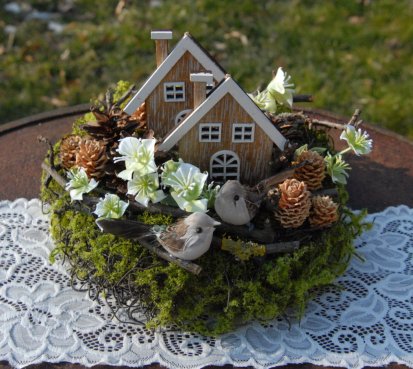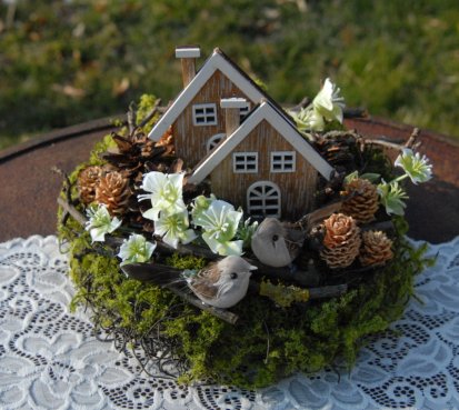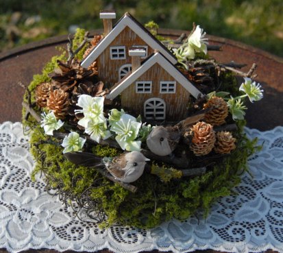 Dekorace je vytvořena z přírodních materiálů, chaloupky jsou dřevěné....dva roztomilí ptáčci k tomu