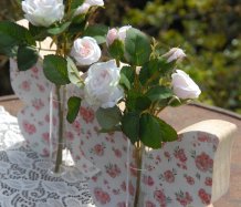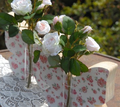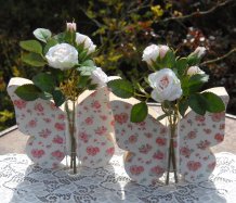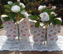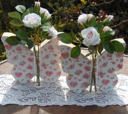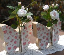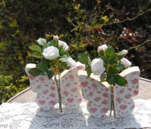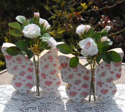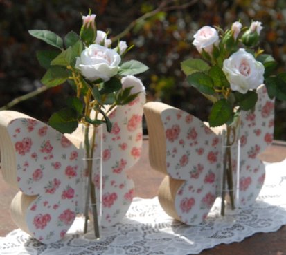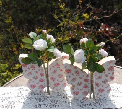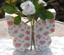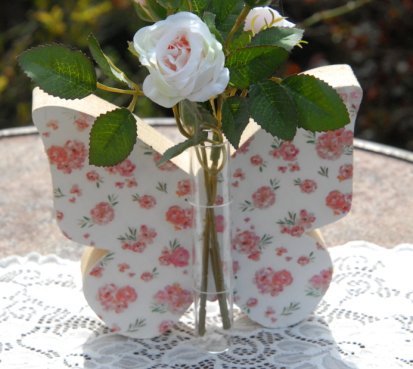 Motýl je vytvořen ze dřeva, polepen růžičkovým dekorem, k němu je připoutaná vázička s dokonalými umělými růžičkami....do vázičky lze nalít vodu a vložit čerstvé květiny