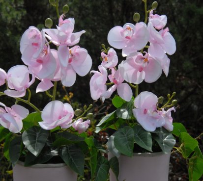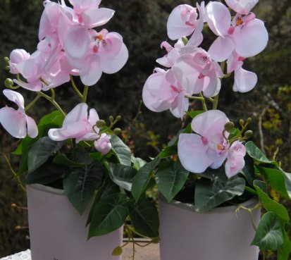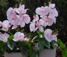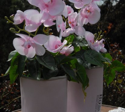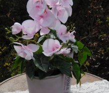 Krásná umělá orchidej je zasazena do keramické nádoby