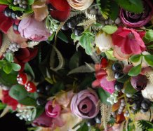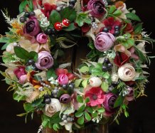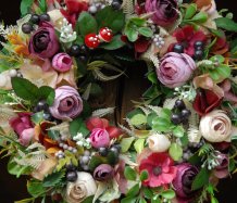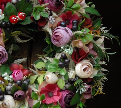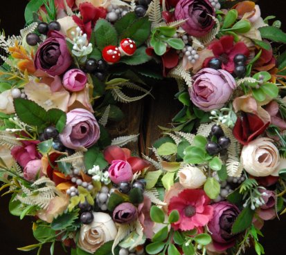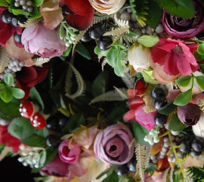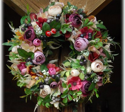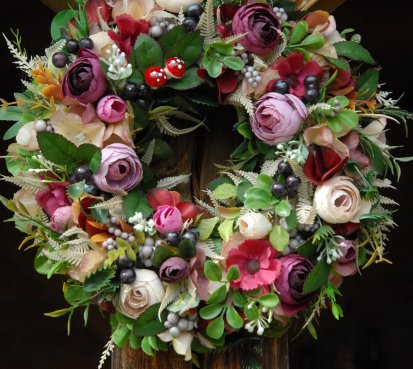 Bohatě zdobený věnec dokonalými umělými květinami a plody