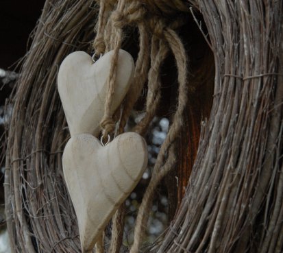 Veliký věnec je vytvořen z přírodního proutí, ozdoben dřevěnými srdíčky a mohutným provazem
