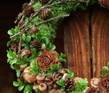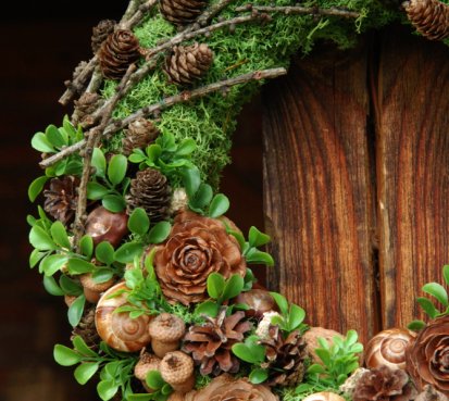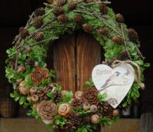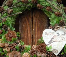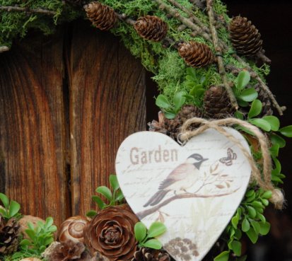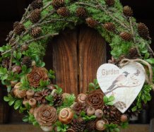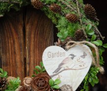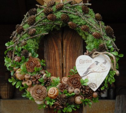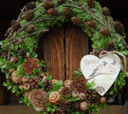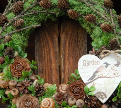 Veliký mohutný věnec z přírodnin je vytvořen na pevném korpusu, srdíčko s motivem ptáčka je dřevěné, lístečky jsou umělé, ale dokonalé
