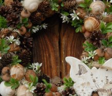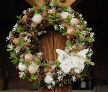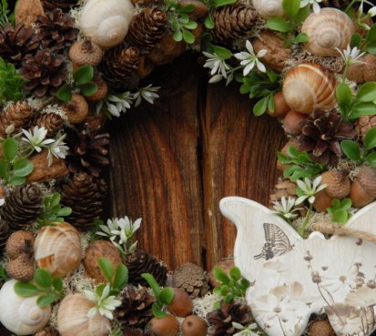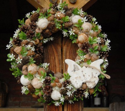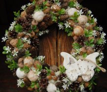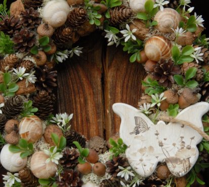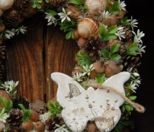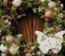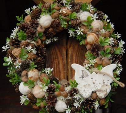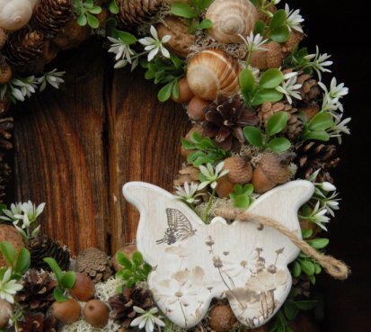 Velký mohutný věnec je vytvořen na pevném korpusu, bohatě zdoben přírodninami a dokonalými umělými kvítky...krásný dřevěný motýl k tomu