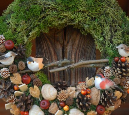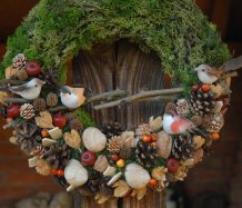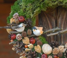 Věnec je vytvořen na pevném korpusu ze slámy, proutí a mechu...zdobeno přírodninami a roztomilými ptáčky