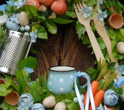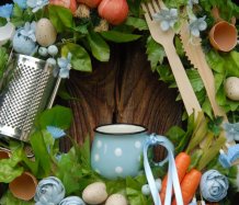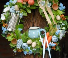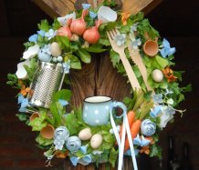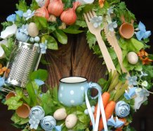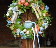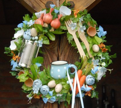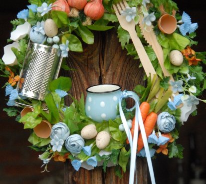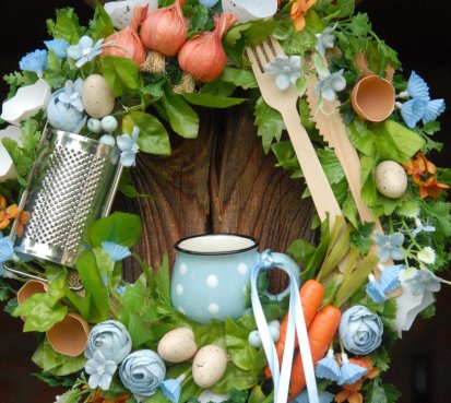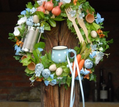 Věnec je nazdoben dokonalými umělými květinami a kuchyňským náčiním
