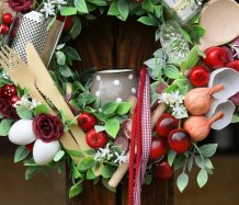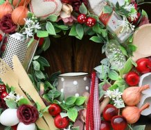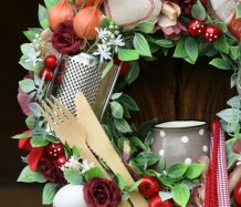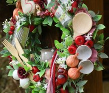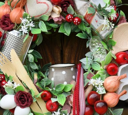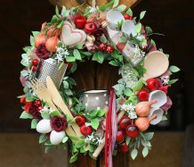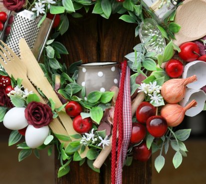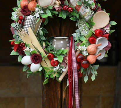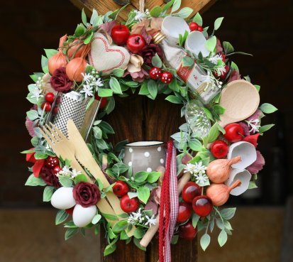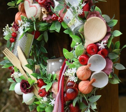 Bohatě zdobený věnec kuchyňským náčiním a dokonalými umělými květinami