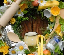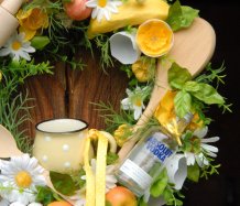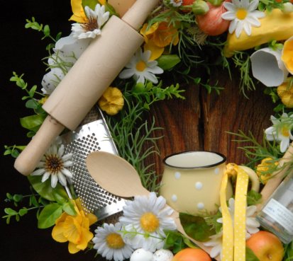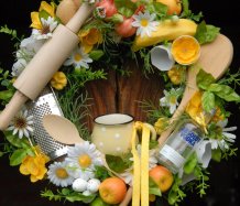 Bohatě zdobený věnec kuchyňským náčiním a dokonalými umělými květinami