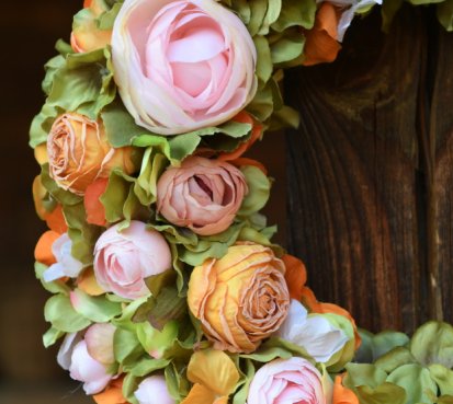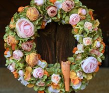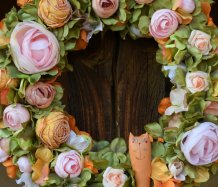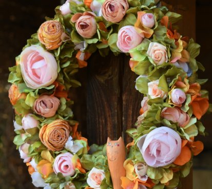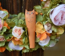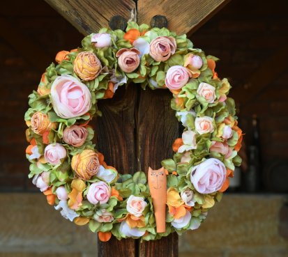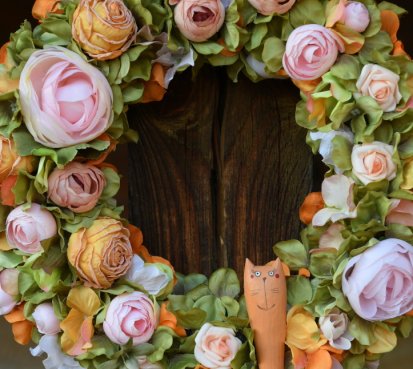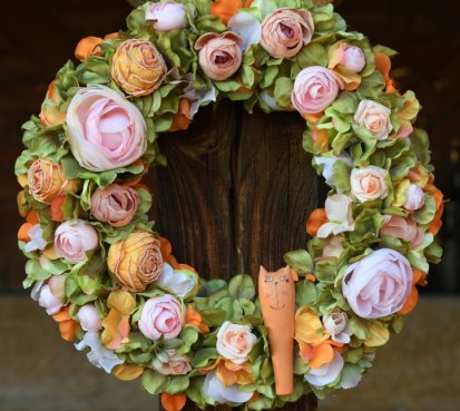 Věnec je vytvořen na pevném korpusu, bohatě zdoben umělými květinami a roztomilou dřevěnou kočičkou
