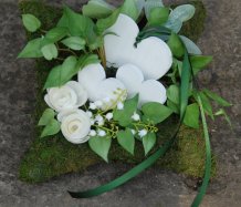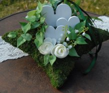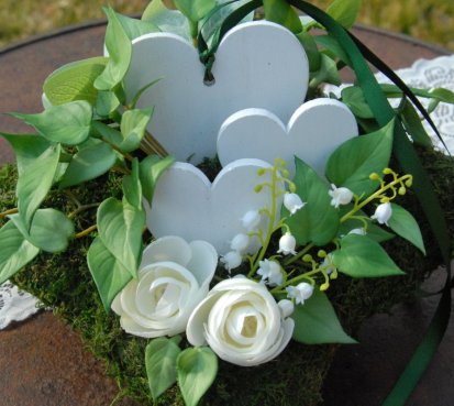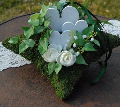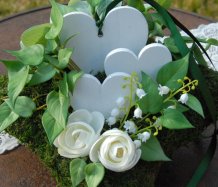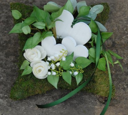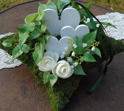 Dekorace s dokonalými umělými květinami a dřevěnými srdíčky je vytvořena na těžkém mechovém polštáři