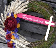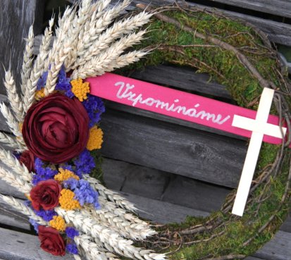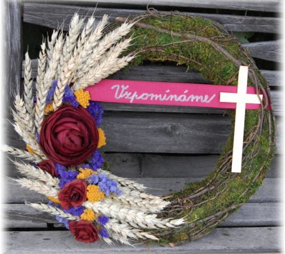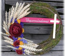 Dekorace je vytvořena na pevném mechovém korpusu, ozdobena sušenými a látkovými květinami.....s dřevěným křížkem