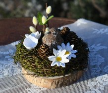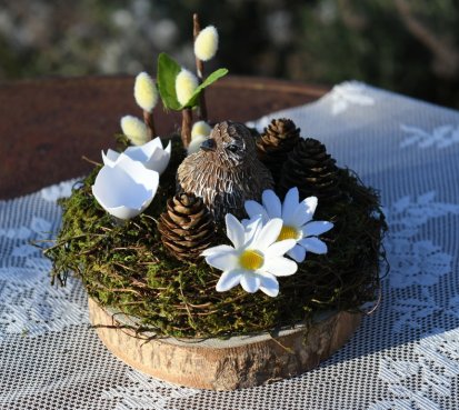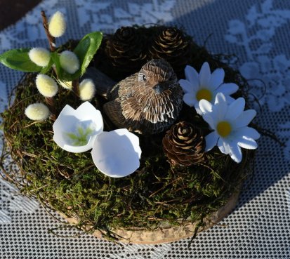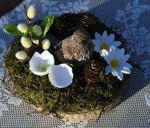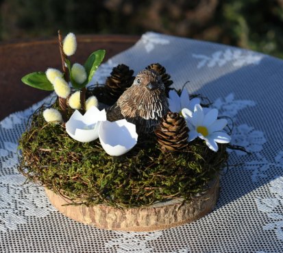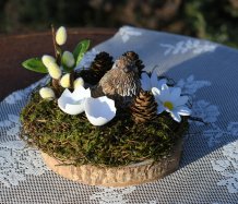 Hnízdečko je vytvořeno z jemného proutí, naaranžováno na dřevěné kulatině.....roztomilý ptáček je z polyresinu