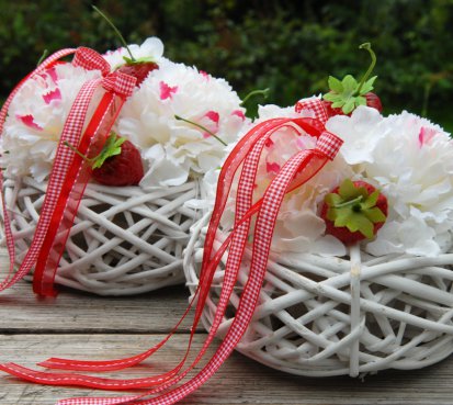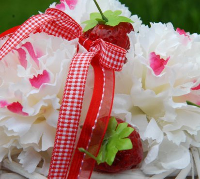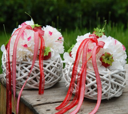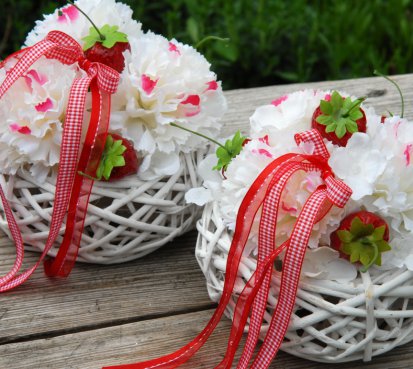 Kulaté proutěné misky jsou naplněny látkovými květinami a dokonalými umělými jahodami, ozdobeno stuhou